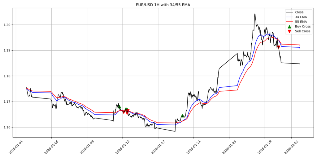 EUR/USD, the world’s most liquid currency pair, accounts for over 20% of global forex volume. Its behavior—driven by ECB and Fed policies, economic data, and risk sentiment—makes it ideal for trend-following strategies like this one. The 34/55 EMA crossover is a Fibonacci-inspired method that balances sensitivity and reliability, helping traders spot momentum shifts amid the pair’s frequent 60-80 pip daily ranges.